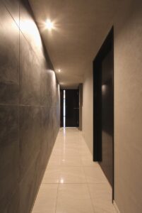 小口径ダウンライトと大判タイルを使ったエントランスリフォームの実例をご紹介します。