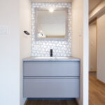 壁にはマットな質感に光沢のある石目模様が特徴的な600角の大判タイルを施工。