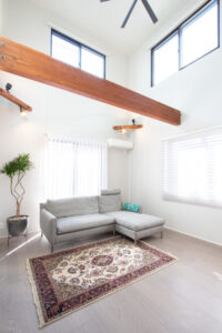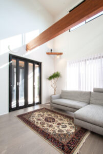 構造上必要な梁は残し、補強を行う事で広々とした吹き抜け天井が実現できました。