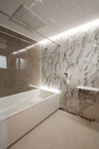 大判タイルのようなダイナミックな石目柄に間接照明が入り豪華なビジュアルになっています!